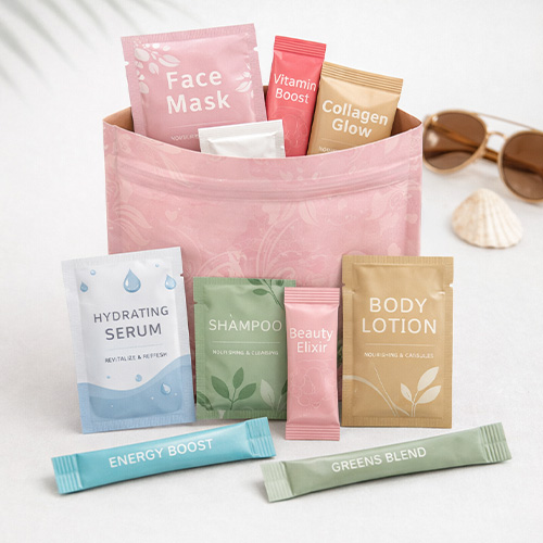 Instead of selling products individually, brands can bundle together a collection of small sachets or stick packs inside a pouch to create a complete travel essentials kit. These kits can include everything someone might need for a short trip, all organised in one place.